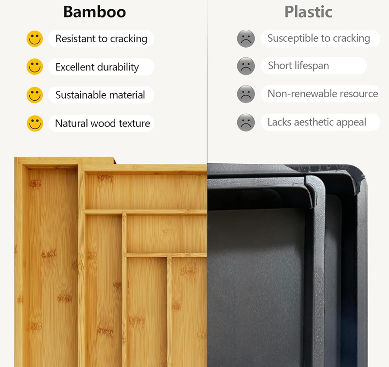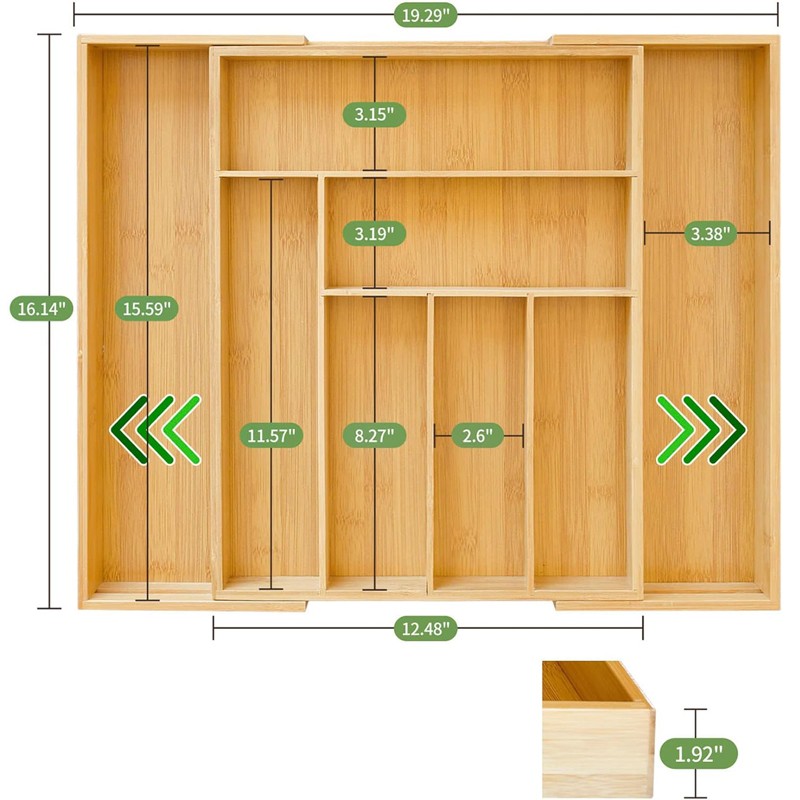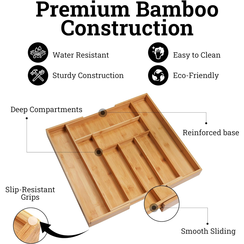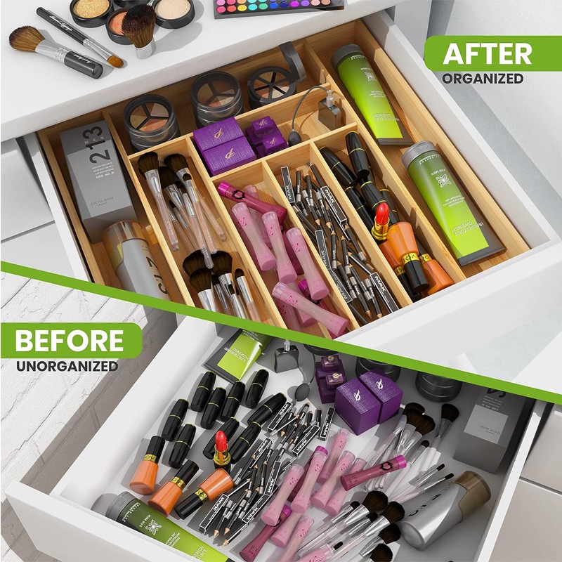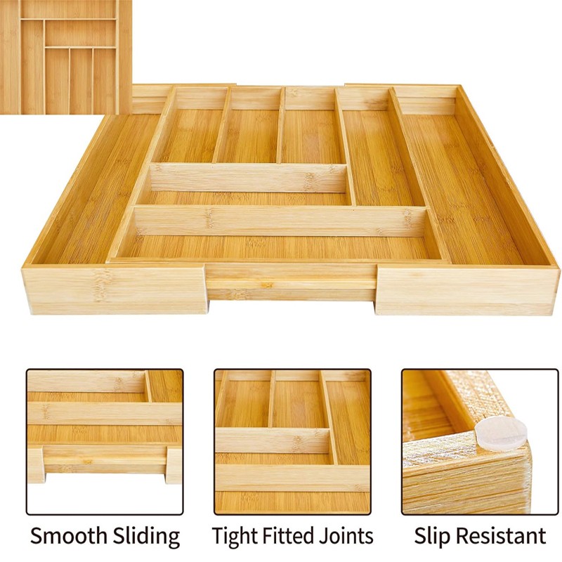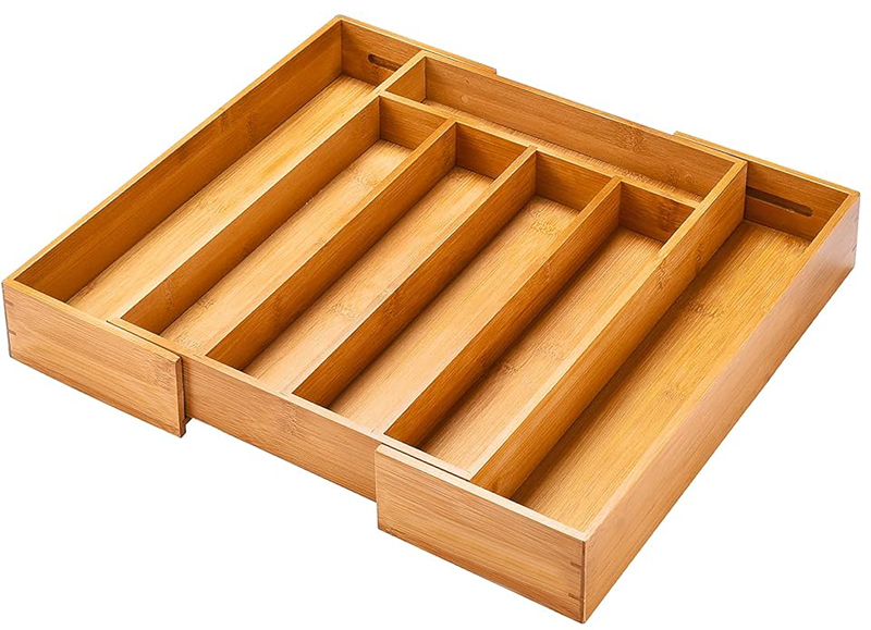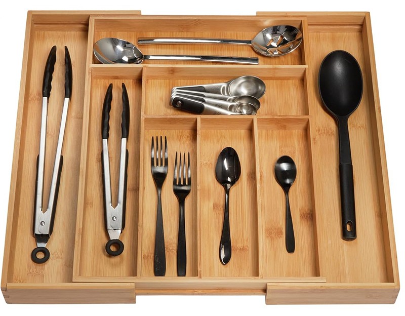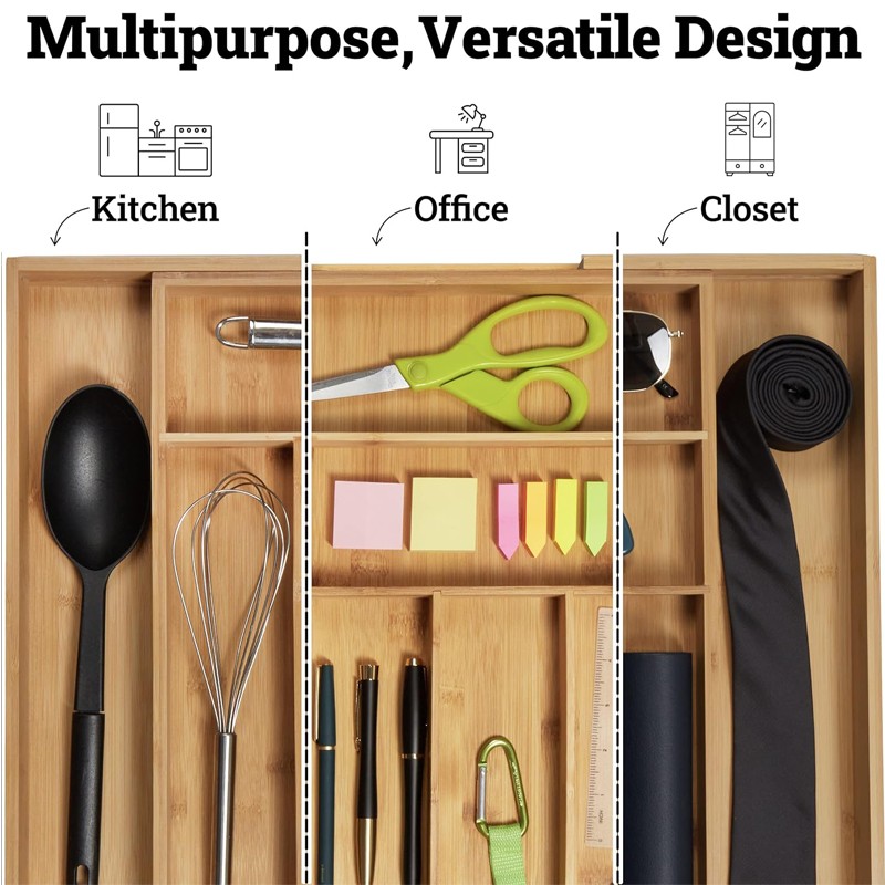 Not only for cooking utensils, flatware, but also office supplies, cosmetics, jewelry, or general “junk” drawer organization is fine for our bamboo organizer.