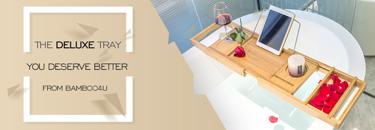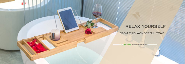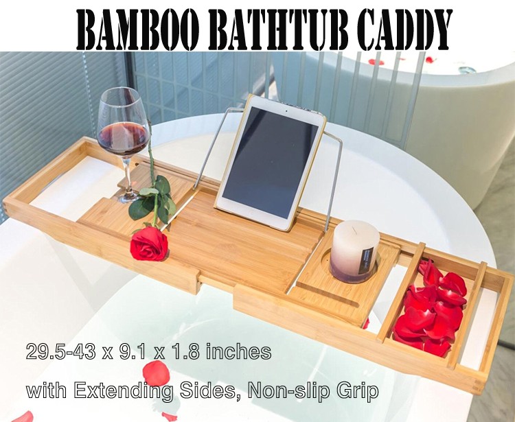 Natural Bamboo Bathtub Caddy with Extending Sides Adjustable Book Holder Tray Organizer for Phone and Wineglass
