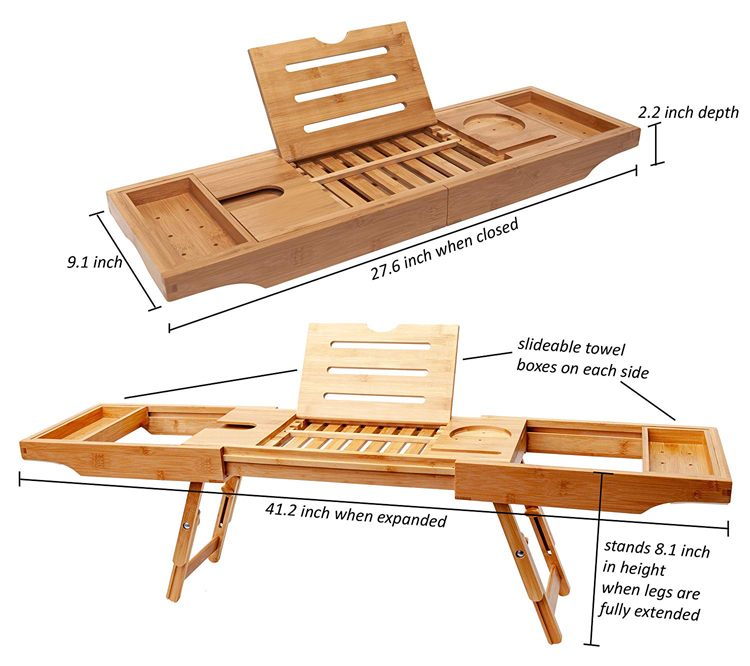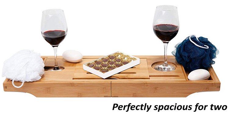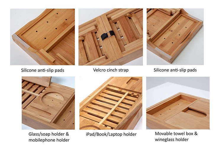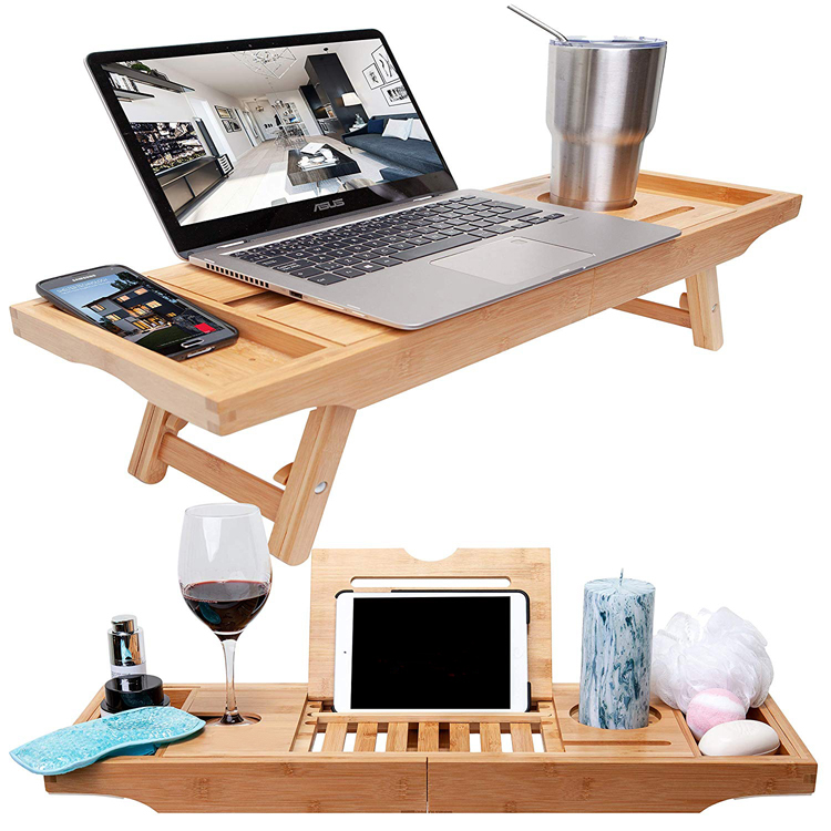 Natural Bamboo Bathtub Caddy with Extending Sides Adjustable Book Holder Tray Organizer for Phone and Wineglass