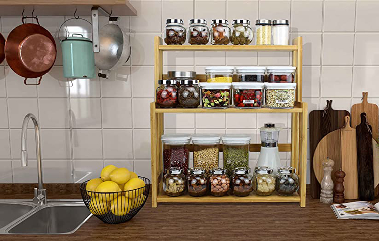 This bamboo spice rack is able to keep spices, jars and other seasonings within easy sight and reach when cooking or baking.