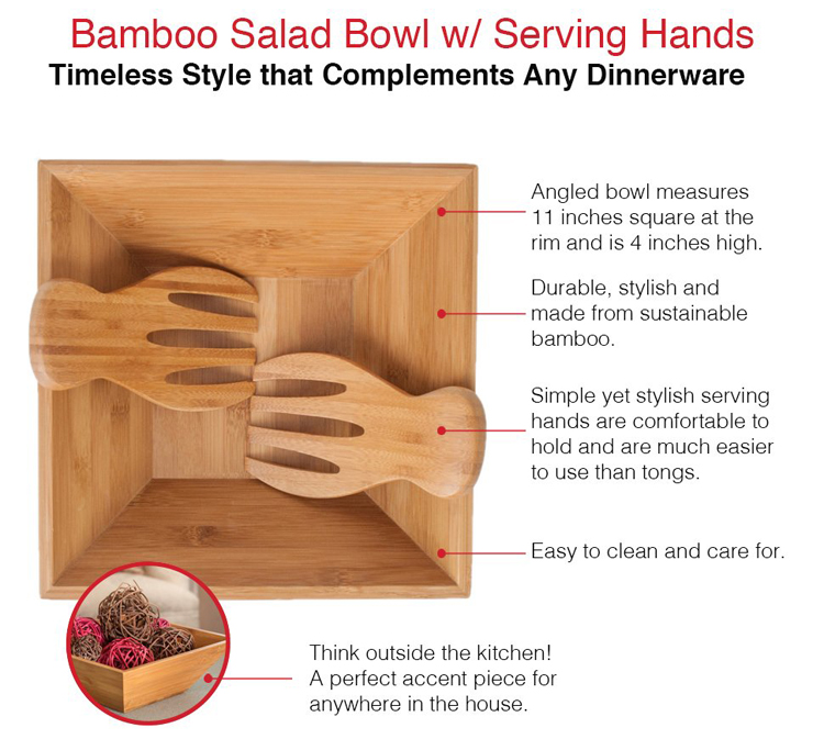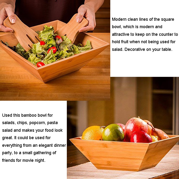 Bamboo Salad Bowl Square Bowl with Serving Hands